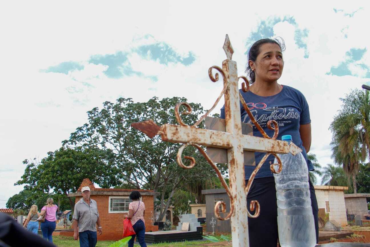 Ela "matou a sede" da mãe e de dois tios que estão sepultados no Cemitério Santo Amaro, em Campo Grande, porque o dia está quente. A cena foi curiosa: sozinha e sentada no túmulo, a mulher abre uma garrafa com água e enche três copos de plástico.
