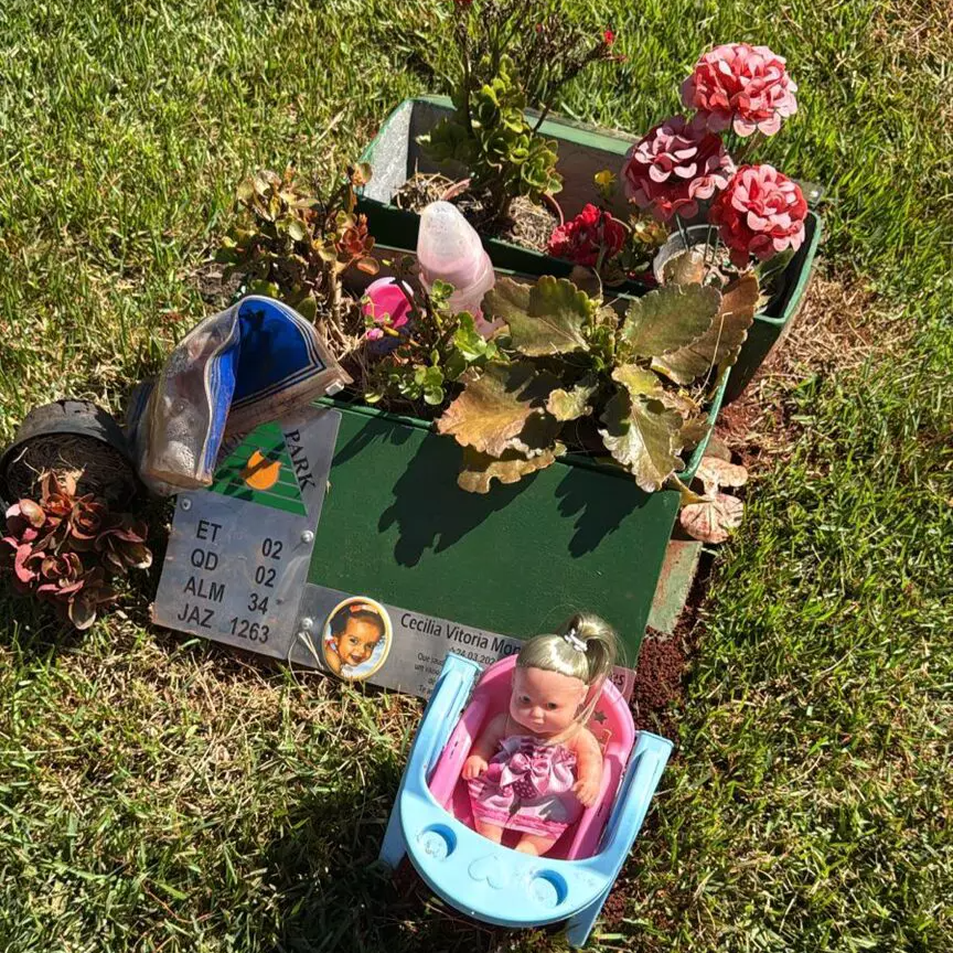 Pertences - No Cemitério Memorial Park, também na Capital, uma das homenagens mais tocantes foi feita sobre o túmulo de Cecília Vitória, que tem a foto de uma menina sorridente. Foram deixadas uma boneca num carrinho e uma mamadeira que provavelmente foi usada pela criança.
