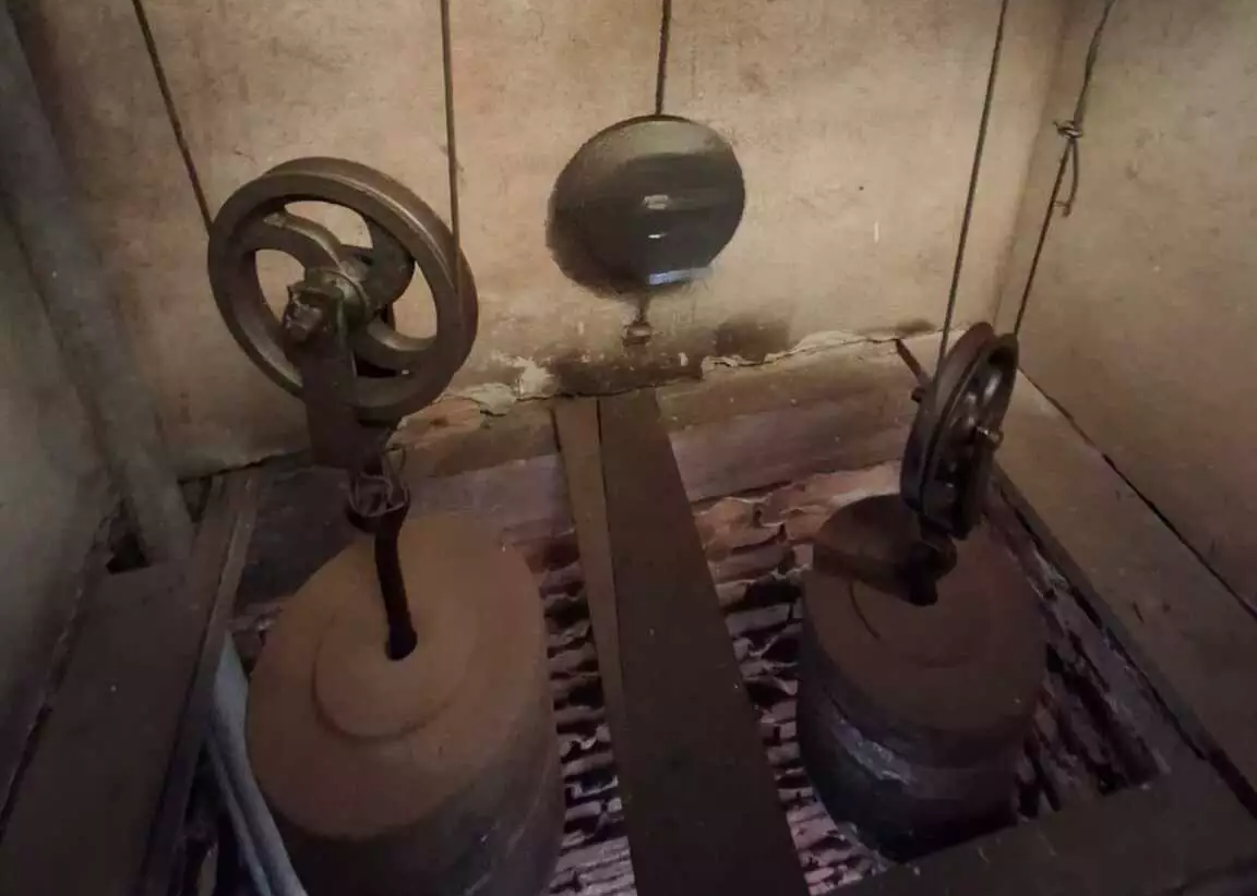 São dois pesos de 100 kg que, a cada batida, descem um pouco. Quando chega perto do chão, no 7º dia, Sueide ergue a corda. Se encostar no chão, ele para de funcionar e de bater as horas.