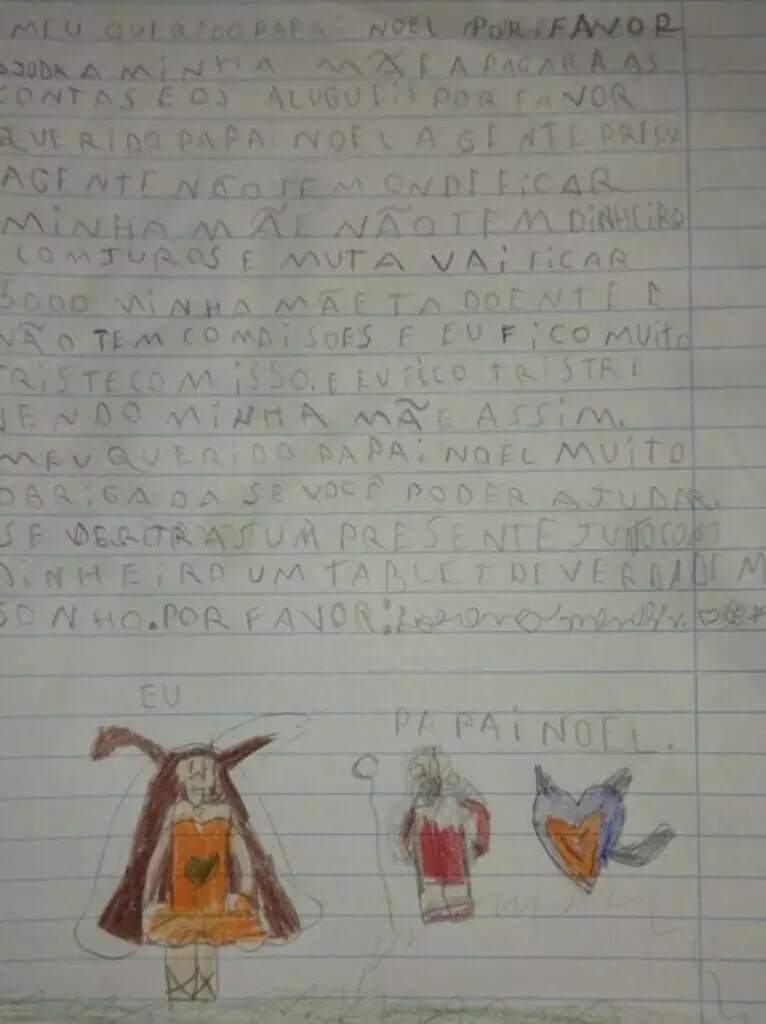Na cartinha, Lorena escreveu que ficava triste em ver a situação da mãe. “A gente precisa, não temos onde ficar. Minha mãe está doente e eu fico muito triste com isso, fico triste vendo minha mãe assim.” O pedido foi feito pelo projeto anual dos Correios.