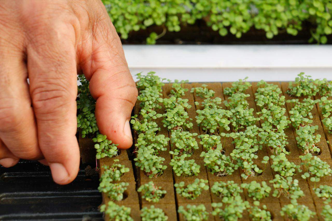 “Ele é bem procurado. É plantado na espuma. Tem broto de agrião também, que vende para restaurantes enfeitarem pratos. O agrião fica na espuma fenólica, dois dias no escuro. Fica germinando e passamos para o berçário. Ele fica mais ou menos de 6 a 8 dias, aí vende como broto. Mais 8 dias na bancada e é vendido como agrião baby. Se bobear, duas bancadas dele vão em um dia, o pessoal gosta.”