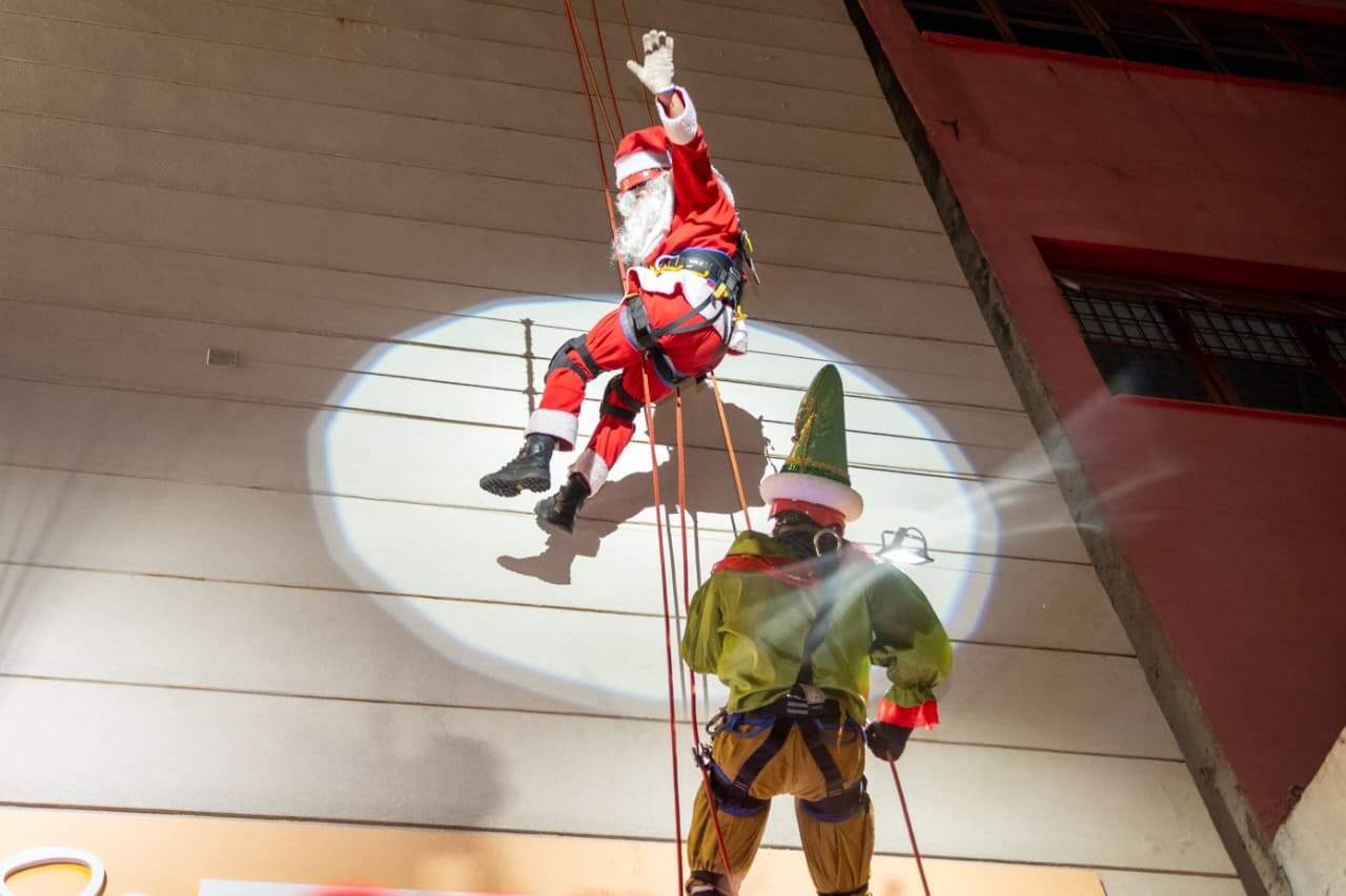 Nada de trenó: Papai Noel inova e chega ao shopping de rapel