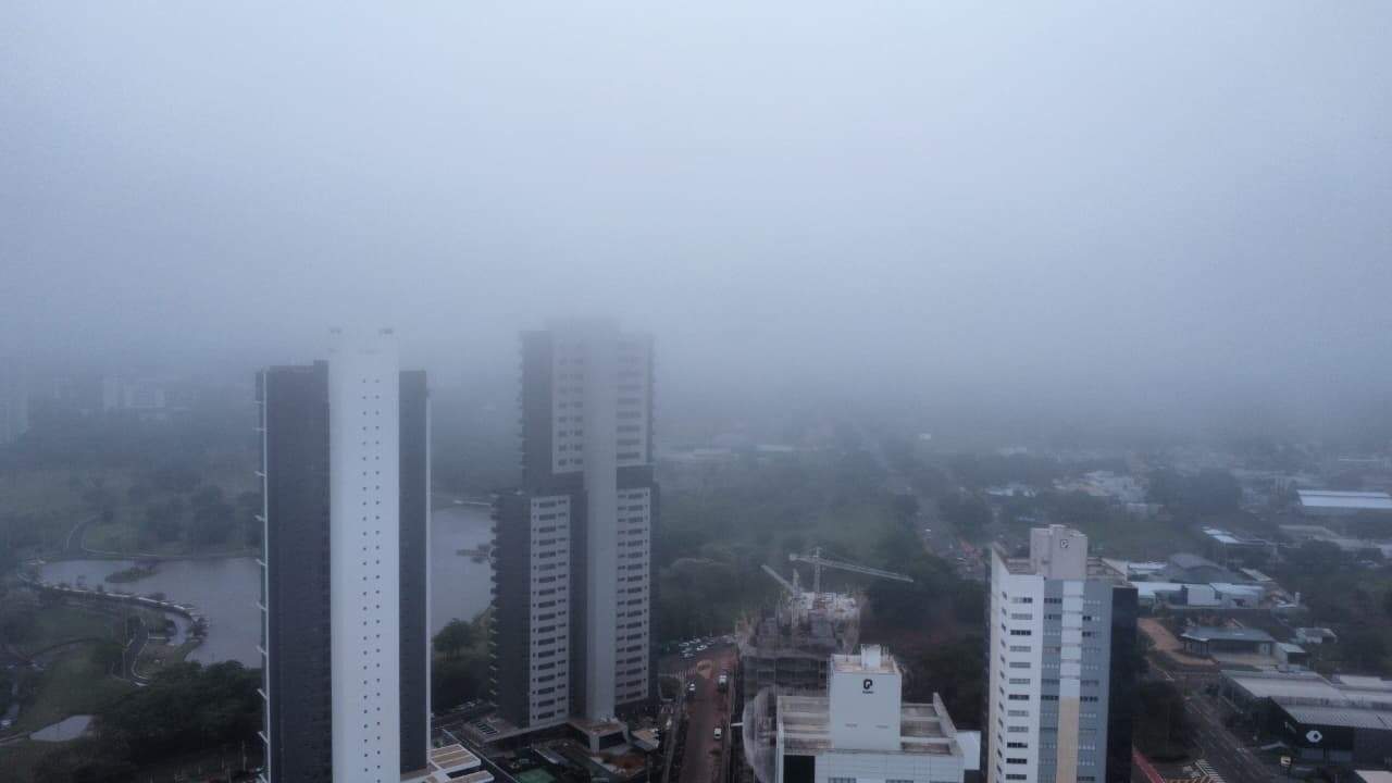 A imagem capturada do alto, pelo Campo Grande News, mostra os prédios quase sumindo pela névoa, reforçando o clima úmido e cinzento que tomou conta do início da manhã.
