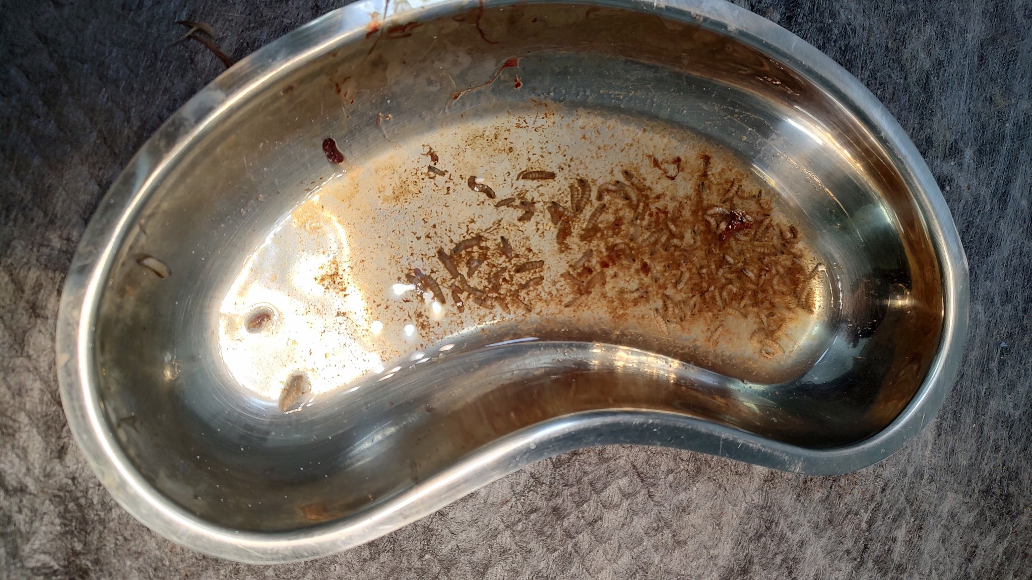 Larvas retiradas do animal na clínica veterinária (Foto: Arquivo da protetora)