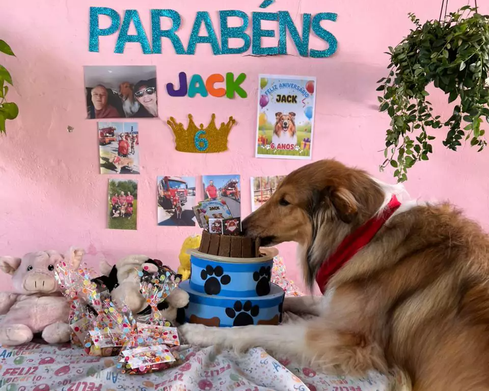 O Border Collie Jack celebrou seu sexto aniversário com uma festa especial, que incluiu decoração, lembrancinhas e um cardápio natural preparado especialmente para os cães convidados. O evento, realizado na creche onde Jack passa as sextas-feiras, é uma tradição anual da família. Além de ser um cachorro de estimação muito querido, Jack atua como cão bombeiro há cerca de um ano, participando de ações sociais com crianças e visitas a hospitais. O Border Collie, originário do Rio de Janeiro, é conhecido por sua docilidade e temperamento tranquilo, características que o tornaram ideal para o trabalho junto ao Corpo de Bombeiros.