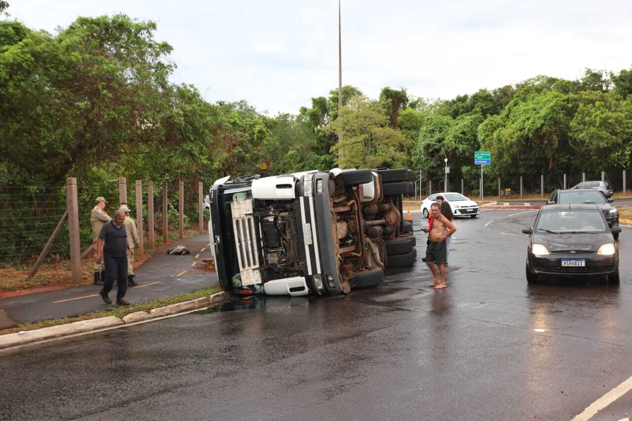 Na última sexta-feira (17), um caminhão-baú frigorífico carregado de carne tombou na rotatória da Avenida do Poeta com a Rua Dr. Abdalla Duailibi, no Parque dos Poderes. O motorista contou que seguia para Corumbá, mas errou o trajeto ao passar pelo pontilhão da BR-163 com a Avenida Ministro João Arinos.