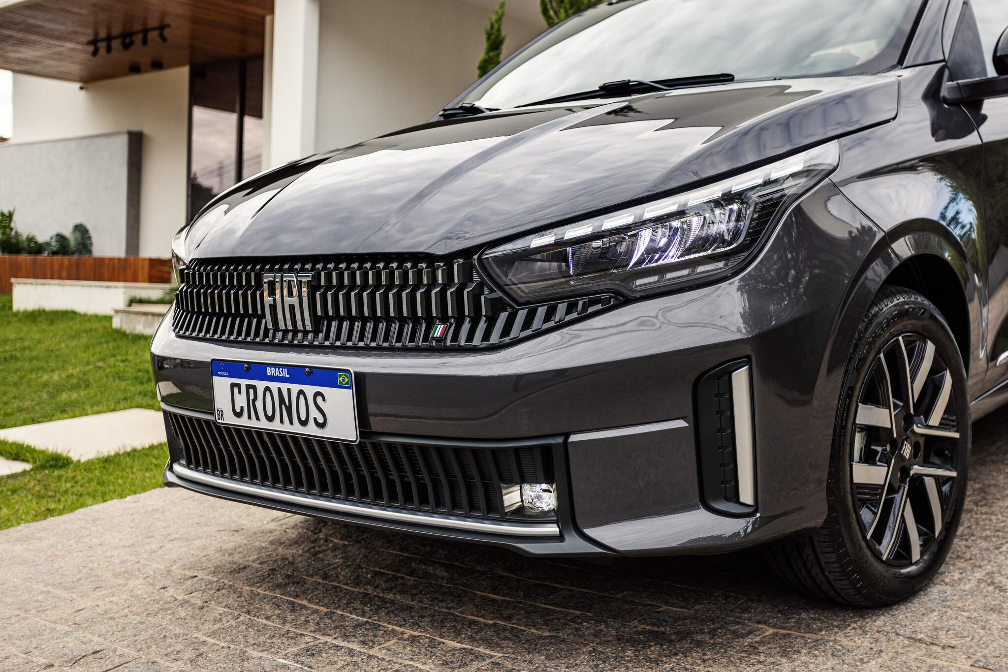 A linha 2026 trouxe mudanças visuais importantes ao Cronos. O novo para-choque frontal segue a linguagem adotada pela Fiat em modelos internacionais, como o Grande Panda, que deve inspirar futuros lançamentos da marca no Brasil. A grade com blocos tridimensionais distribuídos horizontalmente conecta os faróis e amplia a percepção de largura, conferindo ao sedã uma frente mais retilínea e séria.